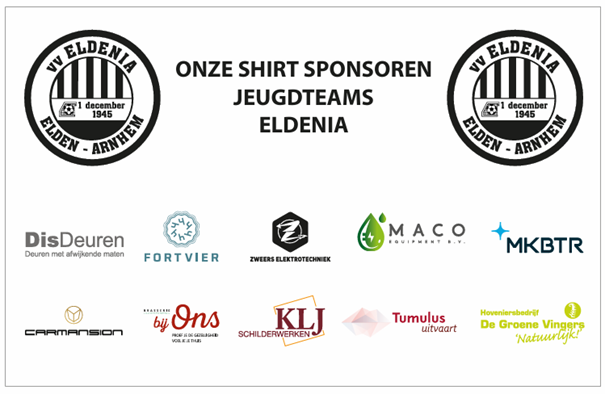 Wij zijn als Eldenia bijzonder dankbaar dat deze bedrijven voor de komende 3 jaar het kledingplan mogelijk maken. Wij hopen dat iedereen, sponsoren en leden erg veel plezier hebben van de kleding